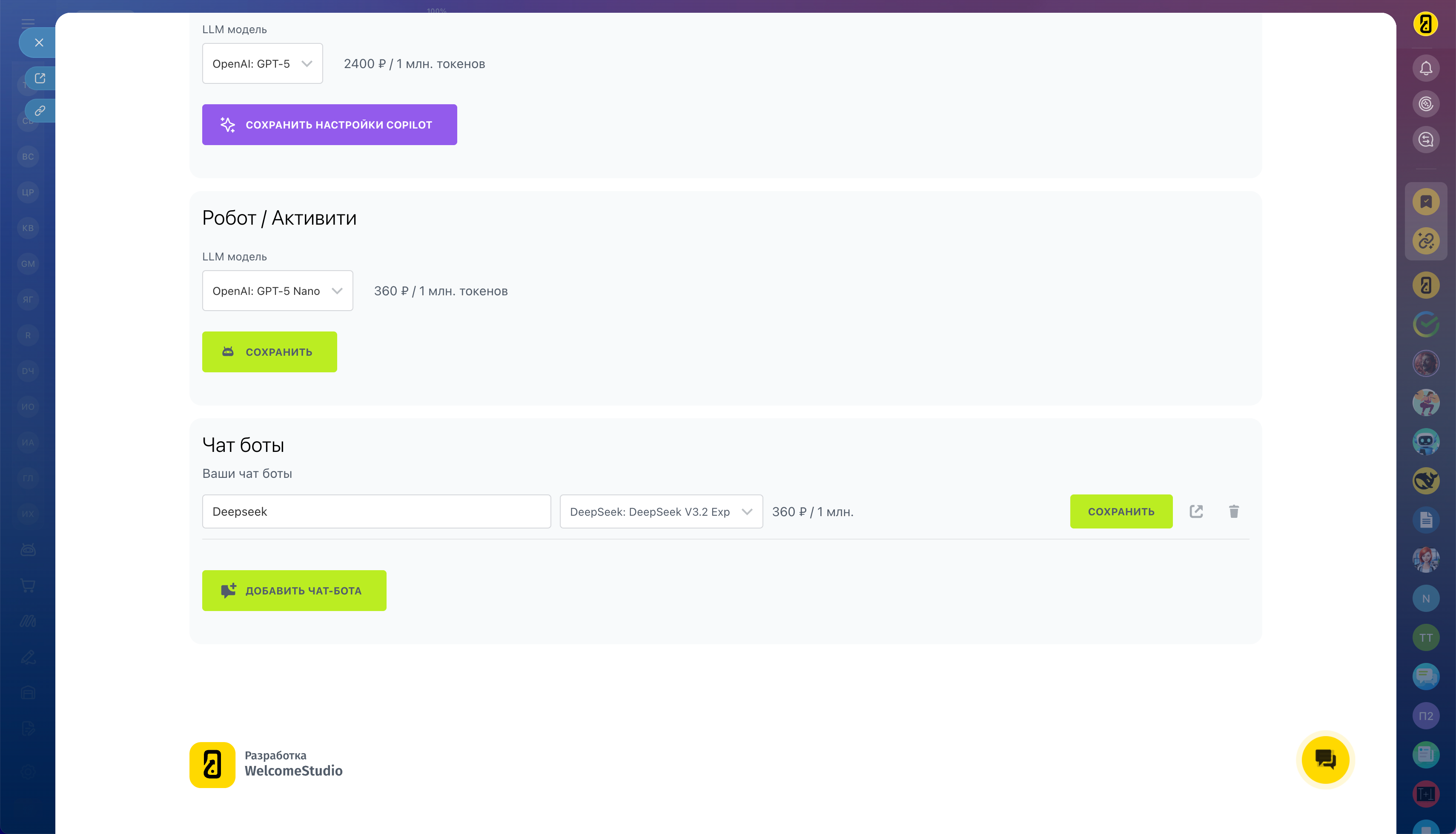 Для каждой сущности вы сами выбираете, на какой LLM-модели она будет работать. При выборе отображается стоимость токенов, а тарифы всегда актуальны — они напрямую зависят от цен провайдеров.