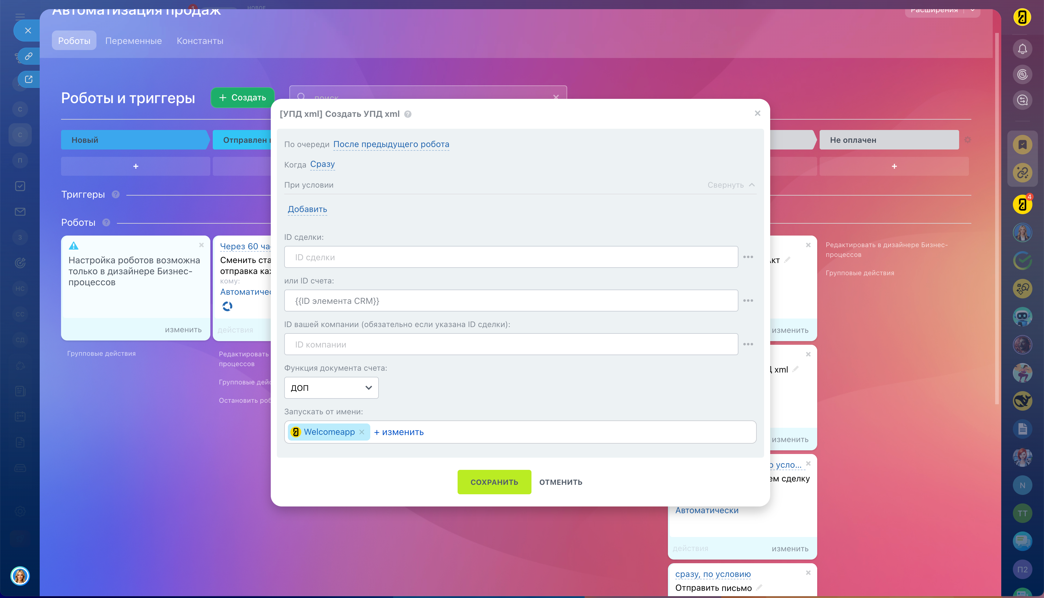 Приложение добавляет в ваш Битрикс24 роботов и активности для бизнес-процессов, которые формируют УПД (Универсальный передаточный документ) в формате XML. Это идеальное решение для компаний, ведущих первичную документацию в CRM.